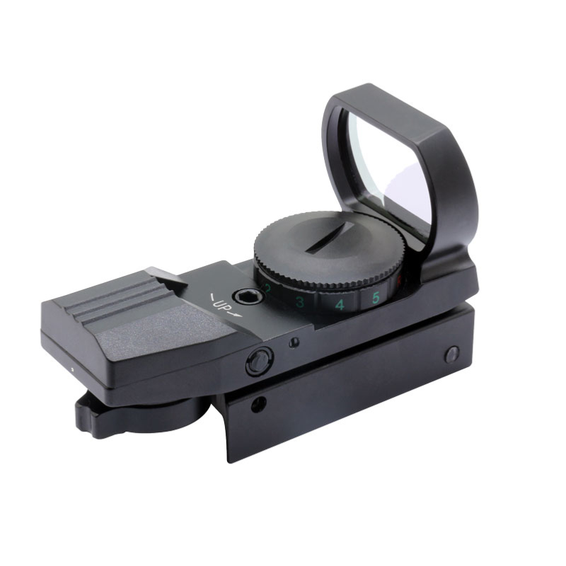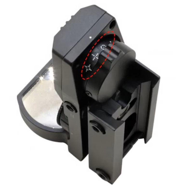Ce viseur se distingue par son système de visée polyvalent : choisissez entre 4 motifs de réticules (Photo 3 : point, cercle avec point, croix, croix avec cercle et point) selon votre préférence et le type de tir. Vous pouvez également alterner entre la couleur rouge ou verte, chacune disposant de 5 niveaux d’intensité lumineuse, pour une visibilité parfaite quelle que soit la luminosité ambiante. Les motifs se changent à l'arrière du viseur à l'aide d'un switch et la couleur et l'intensité avec une molette sur le viseur